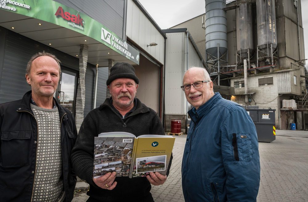 BILDETEXT: Per og Bård Vikaune sammen med lokalhistoriker Kjell Erik Pettersson som har skrevet boka om fabrikkens hundreårige historie. (foto: Jan Erik Sundøy)
